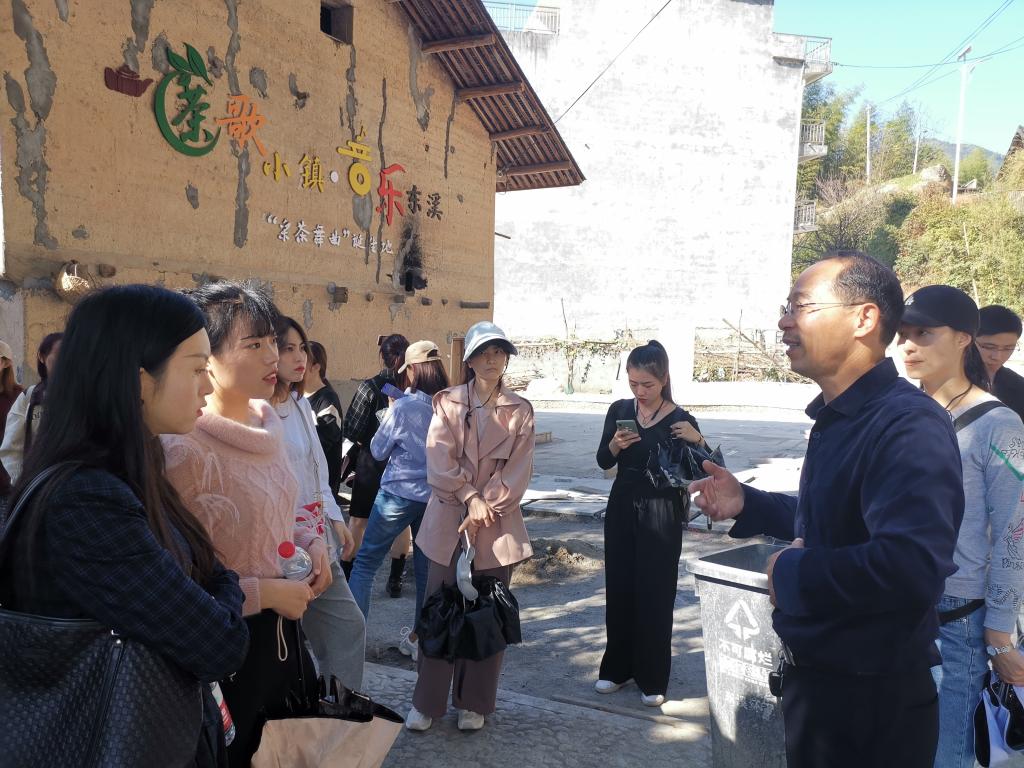 师生在东溪乡蔡书记和何主任的带领下,参观了周大风《采茶舞曲》纪念馆和周大风创作旧址。我们一边欣赏着优美动听的《采茶舞曲》,一边感受着周大风先生音乐创作的魅力。泰顺东溪的音乐氛围浓厚,其在建中的东溪乡音乐小镇是《采茶舞曲》经久不衰的见证,也是当下音乐文化构建旅游产业的一个缩影。