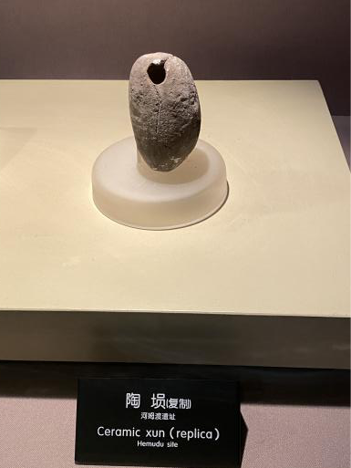 这一展厅则主要展现河姆渡先民的信仰及文化艺术生活。这其中最吸引同学们目光的便是距今7000年之久的“陶埙”和“骨哨”。相传,在新时期时代人们常在石头上穿孔系绳,制成名为“石流星”的狩猎工具。这种狩猎工具在高速运动中与气流相互作用发出“哨音”,好奇的人们把它拿来吹,就这样,这种狩猎工具就慢慢的演变成了“埙”。