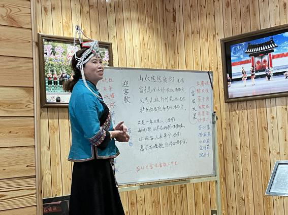 蓝仙兰老师先向大家作了自我介绍,随后简要的介绍了畲族山歌的演唱要求。同学们首先欣赏了蓝仙兰老师美妙的歌喉,在场的各位无不屏气凝神,所有同学都听得非常认真,许多同学还拿出录音设备记录这珍贵的瞬间。一曲终毕,满堂喝彩。蓝仙兰老师热情、细心,早早就给老师同学们准备好了学唱山歌的歌词。蓝仙兰老师教大家唱了两首畲族山歌。第一首,《迎客歌》:“山水悠悠我畲乡(哩喽),畲乡是(哩)个好(喽)地(哩喽)方,又有山林有竹海(哩),(哩喽)村庄面(哩)貌奔(喽)小(哩喽)康”。第二首,《节日歌》:“又是一年三月三(哩喽),山(哩)歌从早唱(啊)到(哩喽)晚。欢迎客人来景宁(哩喽),惠明茶(哩)歌传(喽)四(哩喽)方”。