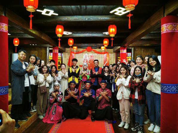 下午1时,同学们来到景宁畲族自治州的原生态村落中,观看当地的歌舞表演,体验了景宁畲族的婚嫁民俗。老师和同学们亲身参与了整个过程,赤郎和大舅哥接绣球,迎亲队伍出发,女方伴娘拦赤郎,赤郎闯关成功后用手把杉刺折下三枝向路边上抛寓意辟祸祈祥,如若赤郎闯关失败,脸上要被抹上锅底灰,惹得满堂哄笑。新郎官还要经过选新娘、接筷子、送彩礼等考验才能拜堂迎娶新娘。整个迎亲过程要放鞭炮三次,鼓吹乐队音乐不停,热闹非凡。