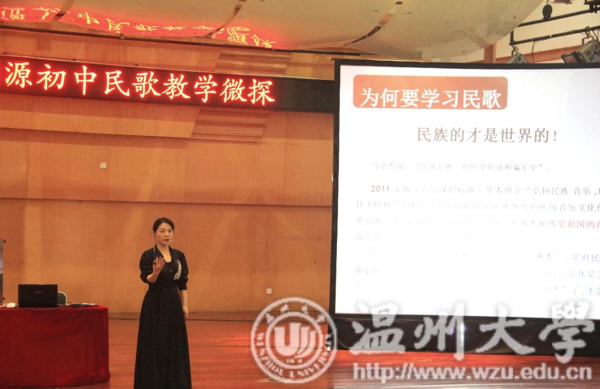 讲座伊始,郑老师向我们介绍了民歌的起源和发展,我们的眼前仿佛出现了一道道历史的长碑,一首无锡景在我们的心中记忆犹新。随后,郑老师带着我们学唱了一遍无锡景,她从音乐的方言、旋律、装饰音、越剧、五声调式这几个方面深入,细致讲解了相关音乐知识。她与同学们热情、积极的互动,同学们聚精会神的听讲。她提出了口传心教、情景法、音乐与人文、歌词创编、原生态的教学方法,极大的启发了同学们,让同学们知道如何去面对教学中的许多困难。之后,郑老师给同学们观看观摩课的视频,以此来引起我们的思考,如何能让教学课堂变得更加活泼活跃,让学生们更加积极的参与到课堂上来。在郑老师的教导下,同学们认识到教学能力以及课堂参与活跃度的重要性,要让孩子们能够润物细无声的得到音乐的滋养。民歌的力量是无穷的,一曲《桃花红 杏花白》容纳了太多人生的酸甜苦辣,这里面浓缩的激情和感动像秋雨一样打动着同学们。讲座接近尾声,一首劳动号子接踵而至“吼嘿,吼嘿!”,郑老师让我们用卡农的形式来唱着劳动号子,将劳动号子的音乐表现的淋漓精致。最后,郑老师让我们铭记尊重和热爱这四个字,尊重老师热爱学生,尊重课堂热爱音乐。我们要在心中秉持着这一点,在音乐的道路上越走越长、越走越远。