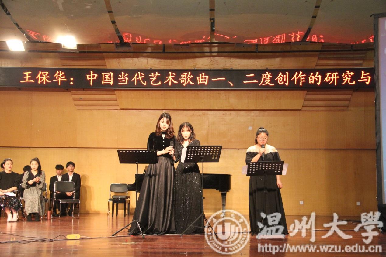 接下来是音院学子带来的艺术歌曲演唱,王教授对每首歌曲都做出了细致的点评,并提出了有效的改正建议。最后,吴群老师为在场观众带来了一首欢快的艺术歌曲《地球是个圆》,把现场气氛再度带入高潮。