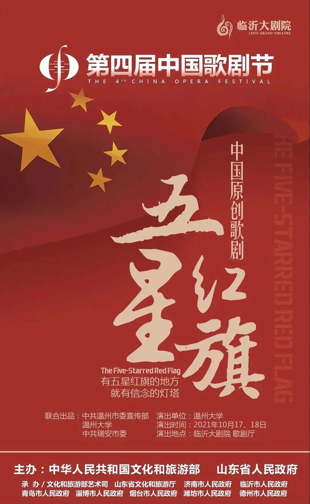 日前,文化和旅游部公布了第四届中国歌剧节参演剧目名单,全国18部新创剧目、6部经典剧目入围展演。老王论坛申报的原创歌剧《五星红旗》位列其中,是入围作品中唯一一部由综合性大学出品参演的原创歌剧。10月17日-18日,《五星红旗》将与江苏省演艺集团有限公司出品的《周恩来》和南方歌舞团、广东珠影乐团出品的《红流澎湃》一起在临沂大剧院演出,再次震撼演绎五星红旗背后的故事。