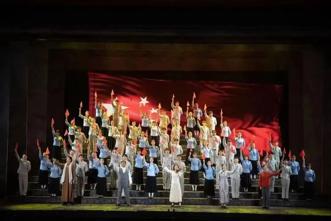 一抹中国红,一腔爱国情。作为一部历史题材的红色歌剧,四幕歌剧《五星红旗》运用了现实主义与浪漫主义结合的艺术手法,以五星红旗的诞生为主线,通过讲述曾联松在1935年南京参加“一二九”学生运动、1941年白色恐怖时期从事重庆地下党秘密情报工作、1945年抗日战争末期瑞安第三次沦陷时的抵抗运动以及1949年新中国成立前夕在上海设计国旗的故事,介绍了在党引领下的广大人民群众一起为新中国的建立创造的不朽功勋,为五星红旗赋予了鲜明的政治色彩与红色文化内涵,也体现温州人民“不忘初心,牢记使命”的家国情怀。
