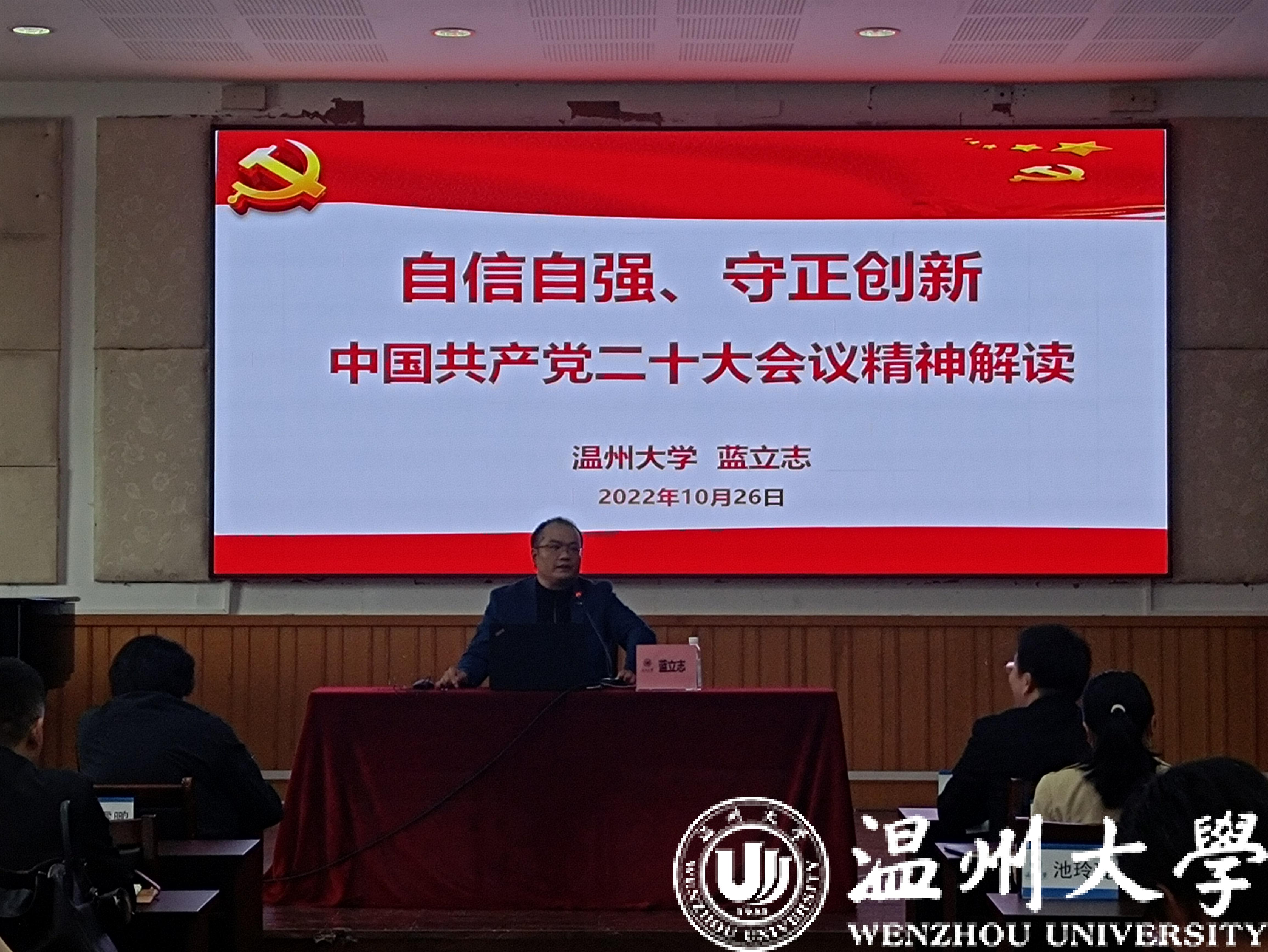 培训中心主任蓝立志作《自信自强、守正创新——中国共产党二十大报告导学》作专题报告。蓝主任从二十大情况简介、深入学习习近平总书记二十大会议报告、理论创新、伟大意义等四个方面进行了深入的讲解。习近平总书记二十大主题报告共分十五个部分,第一至第三部分是总论,第四至第十五部分是分论。