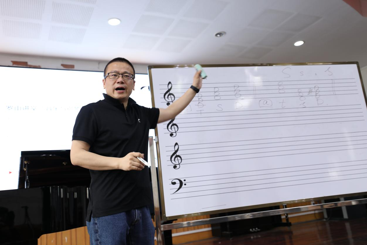 后面老师指出,我们在听流行歌曲或者在演唱会的时候,我们也可以用耳朵去听和声的进行,了解不同曲子的和声发展。我们发现大部分流行歌曲都可以用同一种和声的进行。每首歌曲都有不同的主题动机,当有了动机手段了之后,我们可以采用三种比较实用的方法。第一种:重复。第二种:模进。第三种:节奏相仿。在介绍节奏相仿的方法时,老师给我们即兴创造了几句歌词,让我们根据歌词的停顿和强调,尽情创造歌曲旋律。在仅剩的时间里,张教授又给我们丰富了更多和声的用法,开阔我们的视野,打开我们的思路,让我们对和声有了更新的认识。张教授把我们带入了和声的世界,不断感受运用不同和声的魅力所在。