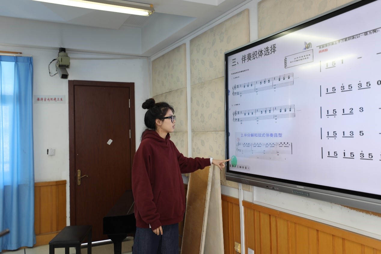 第十五届艺术周暨国家级一流本科专业音乐学(师范)建设系列活动中的“明心”教学示范课之钢琴即兴伴奏课。此次示范课的主讲老师是严伊娴老师。