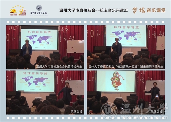 路校区校友活动中心如期开始。王文韬老师以《环球音乐导览》为题,用近两个小时引导校友们徜徉于五大洲!据主讲王文韬老师介绍,设计该讲内容的目的有三:一,与校友们共享环球音乐文化艺术资源;二,引导校友们用全球性的视角看问题,以客观、平等、包容的态度,对待自己不熟悉、不了解的各种民族音乐,以树立正确的世界音乐文化多元观;三,打破以某一、两种音乐文化为中心或审美标准,进而忽视、代替其它的人类音乐文化瑰宝之现状。