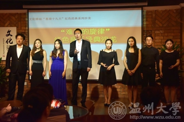 的同学为了迎接党的十九大胜利召开,在温州市文化馆文化驿站成功举办了“难忘的旋律”——红色音乐经典沙龙音乐会。许老师和优秀的温大学子纵情歌唱,他们眼中饱含着深情,闪耀着对艺术的追求。台下聚集着因热爱音乐而在一起的听众,一个秋天的雨夜,台上台下所有的人,都为音乐沉醉。伴随着窗外的微风、场内甜点、美酒的香气,一首首经典老歌为音乐沙龙拉开序幕。参演本场沙龙的还有女高音吕莎、郑思思、许璐、蔡诗琪,男高音林汉霖、陆威宇,担任本场钢琴伴奏的是柏互伟,王传玮。在本场沙龙的最后,许天鸣老师的一首饱含深情的《中国的土地》,在祖国即将迎来第68个生日之际,唱出了在场所有人的心声。