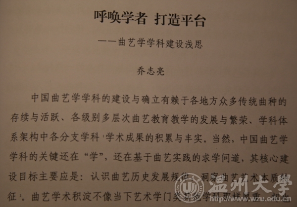 乔志亮教授应邀参会,并发表《呼唤学者 打造平台——曲艺学学科建设浅思》(载入峰会论文集)。近年老王论坛曲艺研究所渐受业内关注,乔志亮所长被推举为中国文艺评论家协会曲艺杂技艺术委员会委员,中国曲艺家协会全国高等院校曲艺教育联盟成员,浙江省曲艺家协会理事,温州市曲艺家协会副主席。所成员即乔志亮、杨古侠、李葳正在撰写温州鼓词陈派艺术的文章,他们将为当地曲艺事业做点实事。