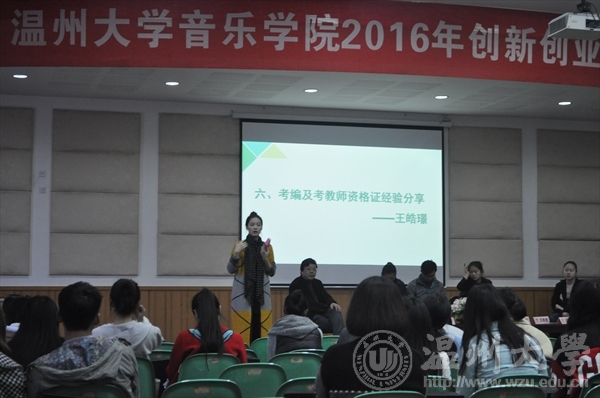 全体16级同学一同在音乐楼201参加了2016年创新创业与就业经验分享会。此次分享会邀请了往届的校友、学长学姐以及相关老师来给大家讲关于考编、考教师资格证、创新创业等内容。分享会由李杰鹏老师主持。 首先是致知艺术国家级创业团队队长王超为我们介绍了致知艺术,以及其主要的作用,并给我们分享了她的创业经历,她说:大学生创业我们收获的不仅仅是金钱,更重要的是走上社会的本钱,在大学就能拥有别人走上社会才感受学习的东西,你将比别人更快一步。致知艺术行政总监沈梦雅为我们总结了致知艺术的创业精神和创业意识:创新为先,专注精神,独立自主,乐观自立,敢于冒险,拥抱变化,创造价值,机会导向,创新为本,整合资源,风险意识。接下来了李杰鹏老师为我们解释了什么是创业,大学生应该如何创业,创业可以被教育吗,学习创业有矛盾吗,没有创业的打算还需要接受创业的教育嘛这几个问题,和大家一一解释讨论,同学们都受益匪浅。网络创新电商方面余耀文学长为讲述了他的电商创业之路。紧接着天之音艺校校长陈红红给我们详细的介绍了天之音艺校,以及她的创业经验,并传授给我们很多她碰到的问题的解决方法,还有创业时需要注意到的问题等。最重要的就是大三的学姐王皓璟的发言了,她着重讲了我们马上就要面临的教师资格证考试,她详细的给同学们讲了考编和考资格证的内容,同学们都很认真的倾听,并做了笔记。
