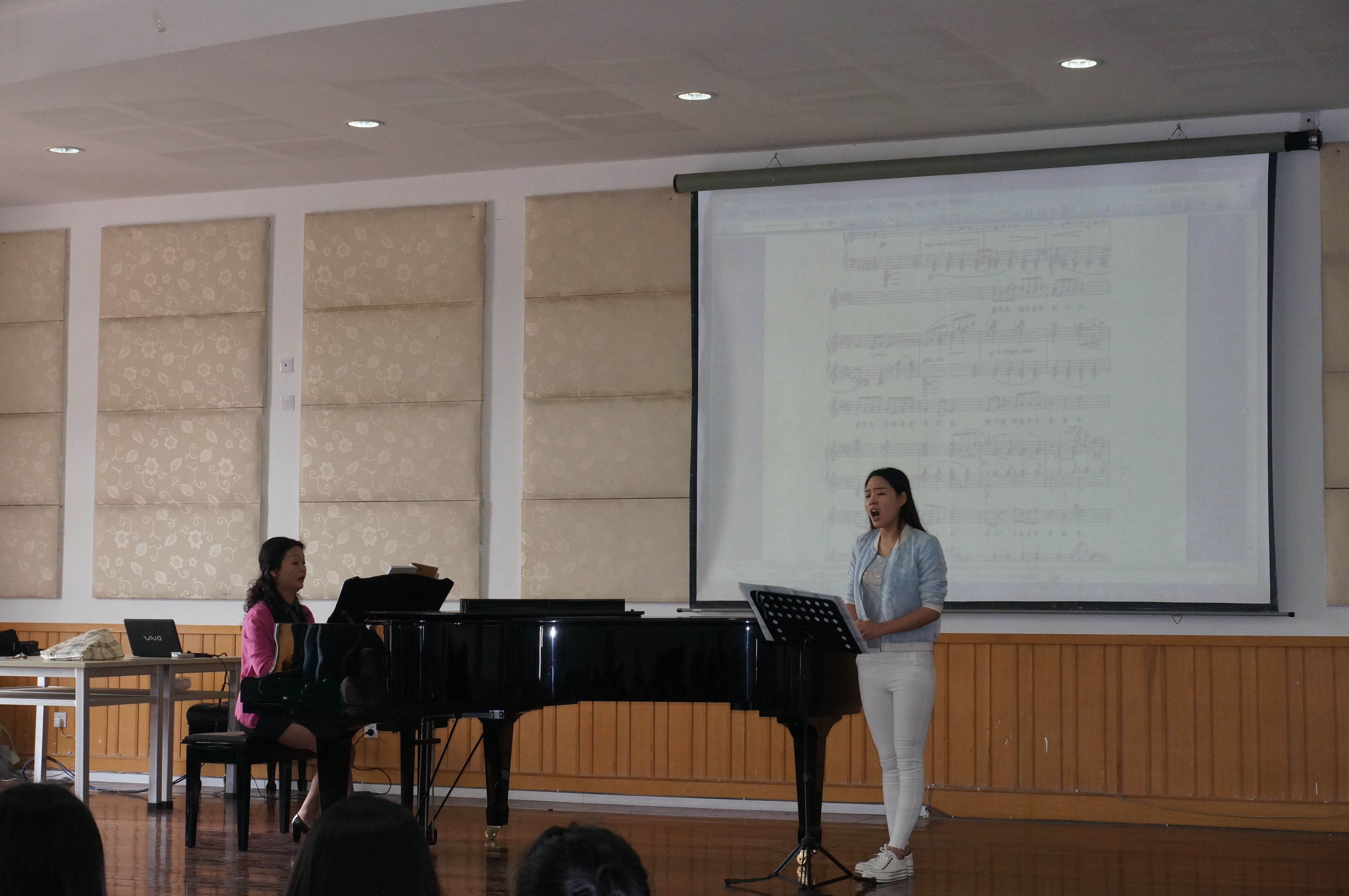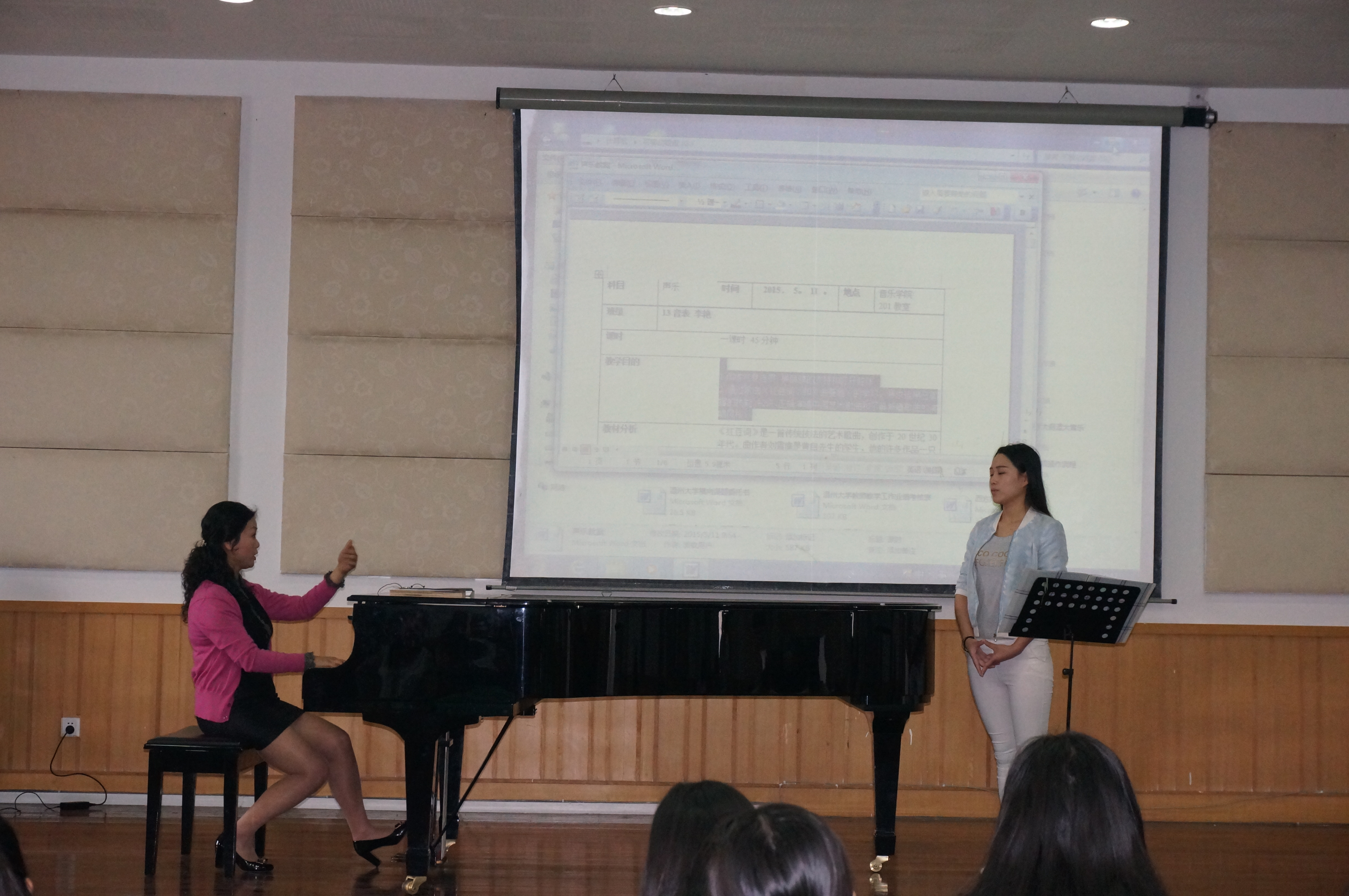 2015年5月11日10:40分,声乐教研室赵群英副教授的《声乐》公开课,在音乐楼201学术报告厅举行。声乐教研室及理论教研室的部分老师参加了该活动。课堂上,赵群英老师为12级学生李艳分析、示范了《红豆词》。赵老师的讲解细腻、分析准确、示范到位。