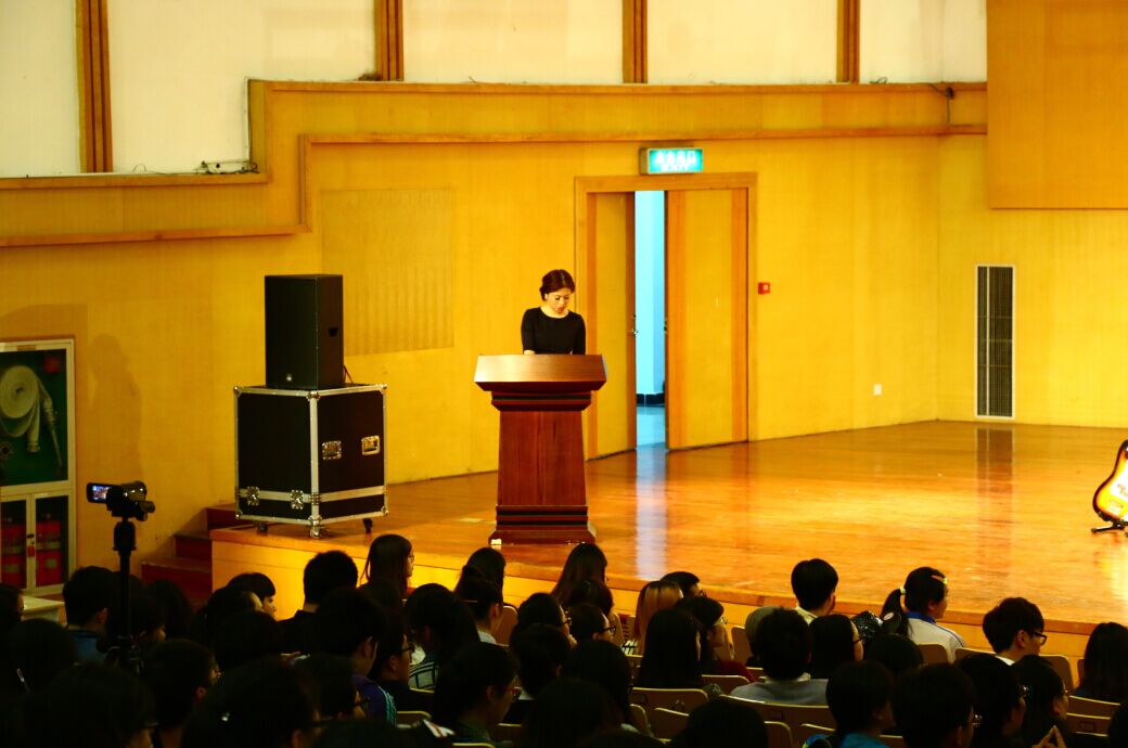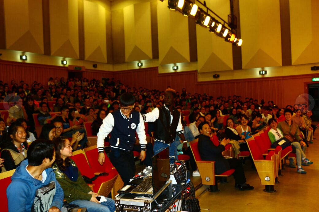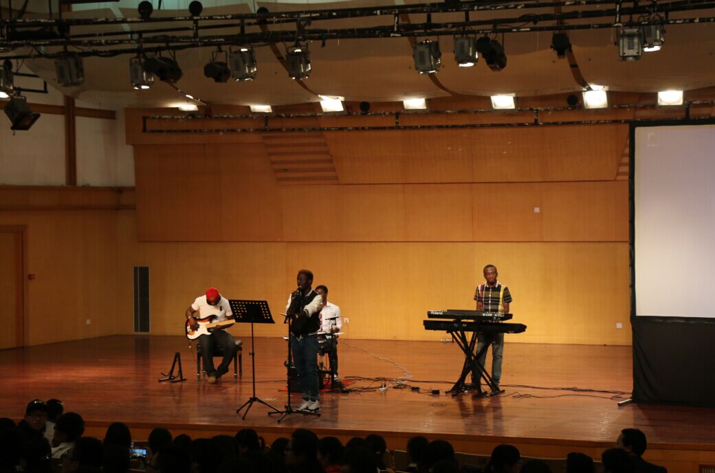 热爱音乐的非洲留学生组成的小有名气的Soul Band乐队,观众对于这突如其来的可以亲身感受美国黑人音乐的机会感到惊喜,现场顿时High了起来。在掌声中,Soul Band乐队的四位成员面带着笑容,英俊潇洒的上了台,和观众热情地打招呼。接下来富春雷教授为大家再现了美国黑人音乐历史,源自美国黑人的爵士乐于19世纪末发祥于美国南部路易斯安那州的新奥尔良市,至今已有百年历史。直至今天,每一种爵士风格都活跃在舞台上。具有强烈持久生命力的爵士乐经过百年的演变和融合,早已突破了地域、种族和国界的局限,成为一种世界性的音乐。美国黑人音乐大致可以分为劳动音乐、宗教音乐和流行音乐三个类别。宗教音乐中最有影响的是黑人灵歌(the Negro spiritual),福音歌(gospel music);流行音乐中则有蓝调(blues)、爵士(jazz)、迪斯科(disco)等不同的品种。在这些品种中,最早出现的是劳动音乐,而最有影响的则是蓝调和爵士。Soul Band乐队为大家带来一首《Amazing grace 奇异恩典》,这首美国乡村福音歌是最初由英国牧师约翰·牛顿作词,James P.Carrell和David S.Clayton作曲的基督教赞美诗,它表达了宗教的忠诚,其中包含着一个平淡但是极富深意的赎罪的故事;接下来代表70年代的由美国著名女歌手惠特妮·休斯顿翻唱的《I Will Always Love You》与代表20世纪的由Jessie J演唱的《Price Tag》带有律动和节奏性的音乐一响起,观众们不由自主的便跟着打起了节奏,乐队主唱邀请了好友一位泰国女孩参与合唱,美妙的声音一亮相,现场氛围到达了高潮,大家纷纷拿起手机记录下这一刻,一曲唱罢,掌声雷动。Black Eyed Peas将多种音乐元素融合,创作出自己独特的hip-hop风格,由乐队带来的《where is the love》便是一个成功的代表。最后乐队献唱了Alicia Keys的《if i anit got you》, 曲调是经典的MOTOWN小调,略带沙哑的唱腔,赢得了观众的阵阵掌声。现场互动也使观众们十分兴奋,随歌而动,几位乐手演奏水平和歌声征服了全场。