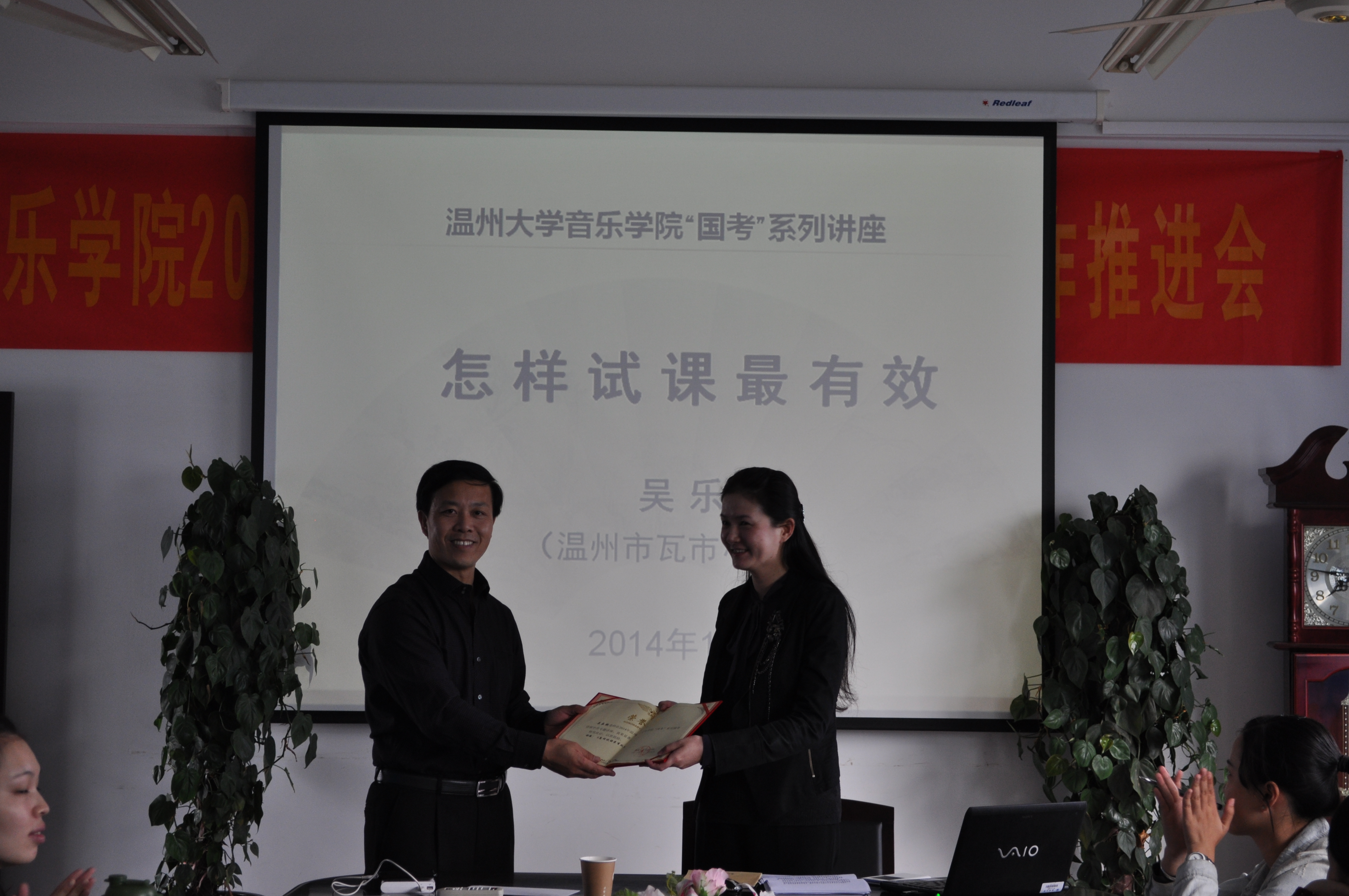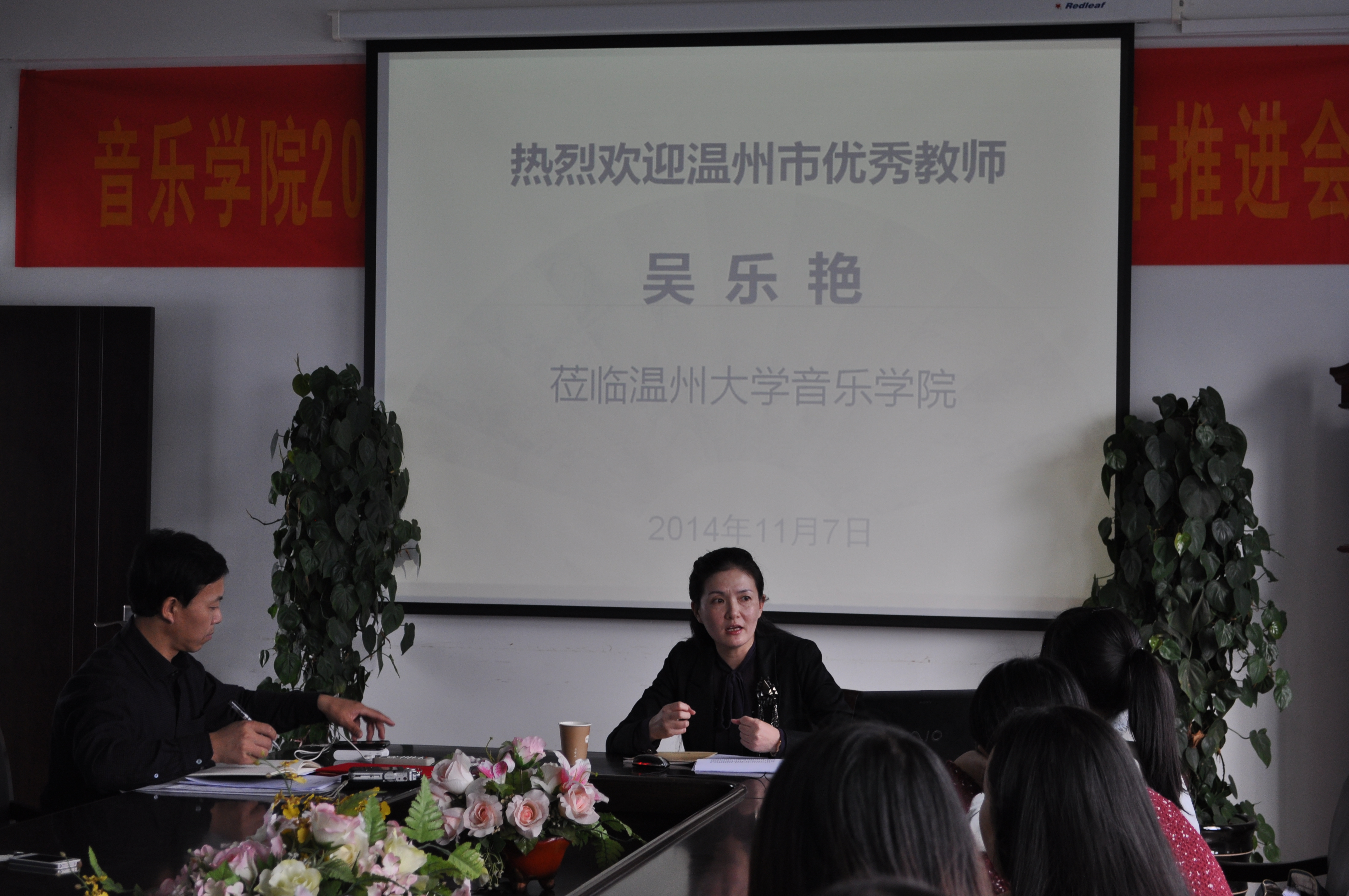 2014年11月7日下午,温州市优秀教师、教坛新秀,瓦市小学音乐教师吴乐艳莅临老王论坛-玛雅论坛-黑料论坛 ,指点学生“试课”的有效途径。老王论坛教学督导王守琢老师与老王论坛-玛雅论坛-黑料论坛 的同学们一起参与了交流。该活动由王文韬副院长主持。 吴乐艳老师就学生“国考”、“考编”之音乐教师国家资格考试过程中的试课环节,给予音乐学、音乐表演专业的学生有益指导。她建议应考的同学,一定要熟悉现行的各个版本的音乐教材,同时要打好“自弹自唱”的技术难关。