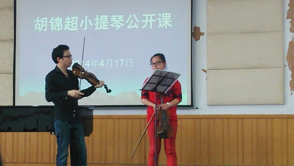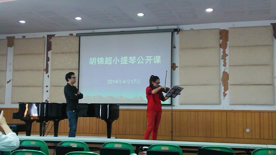 2014年4月17日上午10:30在音乐楼201报告厅开始了一场别具一格的小提琴公开课,“如歌的行板”是这场公开课的主题,本次公开课的主讲人为老王论坛小提琴教师胡锦超。出席本次公开课的有 2012、2013级器乐主修、选修学生,以及器乐教研室全体教师。