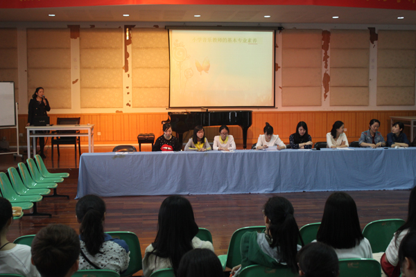 的优秀校友。她们给师弟师妹们提了很多建议,一致认为:“作为小学老师,全面的知识素养十分重要,孩子们经常会向你请教音乐之外的东西”。她们根据自己近一年的工作,感慨道:“首先,作为一名音乐老师,一定要全面。无论你的专长是什么,要想当小学老师,你得提前完成小学音乐教材中所有歌曲的自弹自唱及舞蹈——律动创编内容。为了提高自己的自弹自唱能力,最好更多地为他人去弹伴奏;其次,在读书的四年里,尽量有更多的实习、见习机会,大三开始就太晚了;另外,音乐理论课很主要,理论知识的积累不是几天所能掌握的,要抓住在校时学习的每一堂课。千万别等到大四要去应聘工作了才看书、学习!”