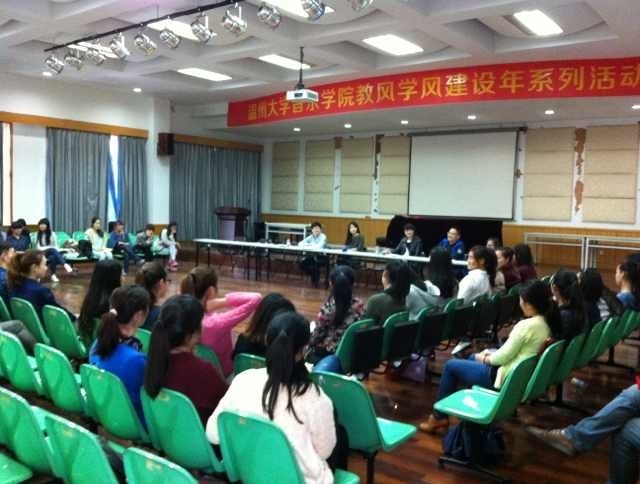随后,各高年级学生代表逐一发言。首先是大四音本班学生代表袁泽浩发言,他以“担任学生干部或团学干部等职务会不会耽误你的学业”这一问题提问了现场的13级同学们,在他幽默的解释下,告诉同学们大学生生活需要努力,需要锻炼。之后,他也提出要相信学习的重要性,简单以他学习合唱与指挥的故事来说明,“书到用时方恨少”是他的真实感悟。最后他提出相信目标的作用,坦言那次与刘青松书记的对话,让他明白确立自己的目标然后一步步去实现,会达到自己意想不到的效果。他说做到以上这些,只是给未来的自己一个交代,使自己能不遗憾。接下来,是大三音表班学生代表肖潇发言,她指出:态度和目标都应该被重视;不要更换自己的专业老师,要相信自己的老师;明白“难得糊涂”的道理;合理分配自己的时间;好好使用学校的资源等,这些都是同学们都应当注意到的。最后是大二舞蹈班张艺瑜同学发言,她所在的12舞蹈班在去年获得了优秀学风班的称号,她也向同学们分享了学风班风的建设经验。她说明除了有班主任的认真领导,还要同学们的齐心协力,懂得如何处理同学间的矛盾处理。接下来的是同学提问环节,有同学询问学长学姐,他们大一的时候“普通的一天”是怎么度过的。学长学姐在指出除了一天的课程学习外,也都有别的兴趣方面的学习。他们都希望同学们能吸取到经验,可以更开心充实的度过大学生活。