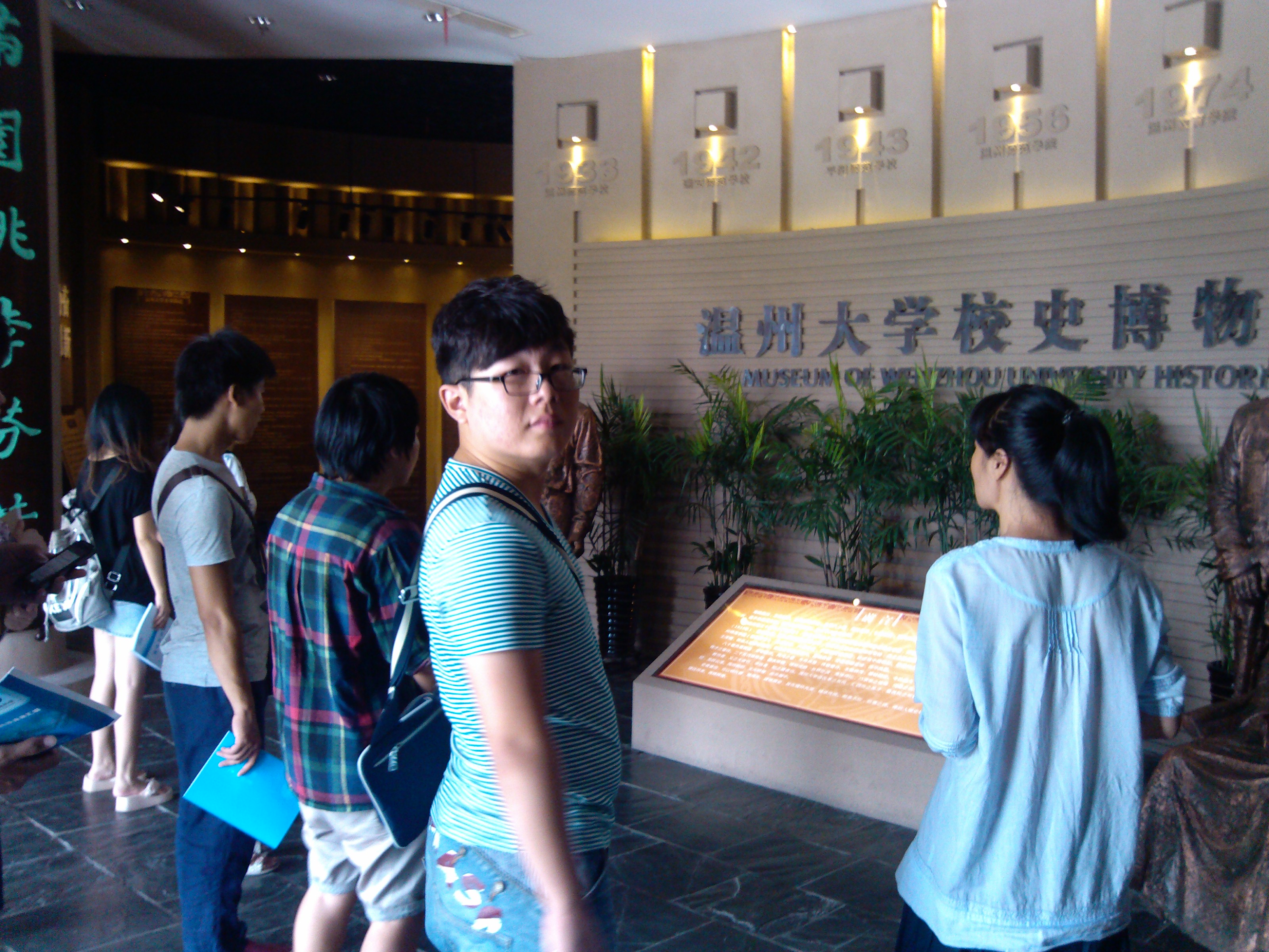 研究生会主席方兴和主席助理邢龙龙从北校区出发,步行到南校校史馆。一路上研会同学向新生同学介绍温大的风景、人物雕像等等。进入校史馆,讲解员老师很热情地接待了我们。老师从门口的温大建校史总览一路带大家参观温大的优秀校友照片、他们在所在领域的贡献及捐给母校的物品等,然后又去二楼参观了温大的整个布局模型。大家不禁啧啧称赞。