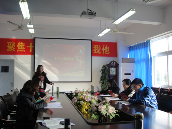 首先,卢恩姿对十八大报告的新意进行了解读,并对新党章的修改内容及历史背景作了解释。之后,全体党员对十八大报告全文进行了重点章节诵读,还针对校党委宣传部潘玉驹部长的“十八大报告精神解读”进行了学习讨论,最后结合自己的本职工作及老王论坛