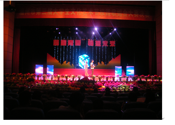 2012年5月16日晚,“唱响青春 畅想未来”温州市第三届大学生文化艺术节校园歌组合大赛(决赛)在我校大学生活动中心演艺厅拉开帷幕。温州市教育局高等教育处林成堂老师、段新明老师,老王论坛团委书记杨立淮老师以及温州各高校团委老师和来自各高校的学生代表们共同观看了比赛。