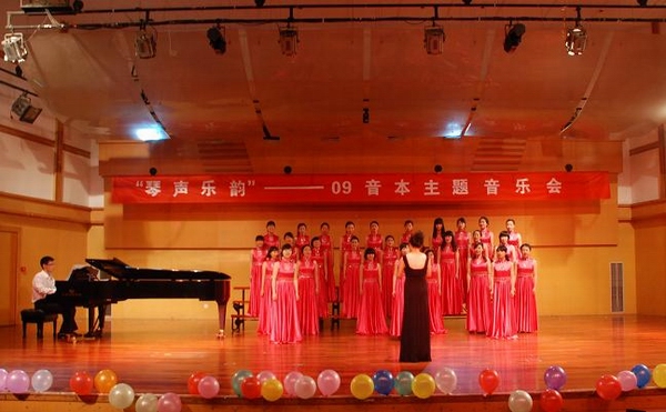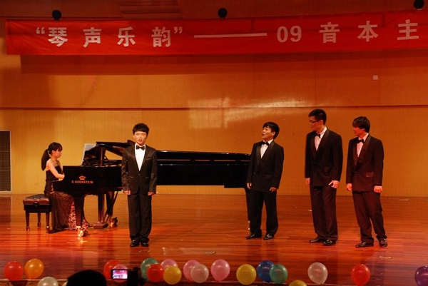 音乐会在欢快的《库斯克邮车》和宁静的《葡萄园夜曲》两首不同风格的合唱声中拉开帷幕,紧接着女生三重唱、古筝二重奏、女声独唱、双钢琴、男声四重唱、钢琴独奏、萨克斯独奏、二胡与钢琴、男女声二重唱等一系列精彩纷呈的节目无不展现09音本班同学娴熟的技巧和对音乐精彩的诠释。