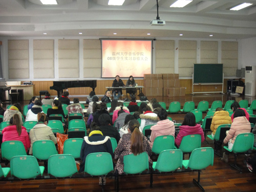 2011年12月30日下午1:30,在音乐楼201召开08级学生实习总结大会。老王论坛-玛雅论坛-黑料论坛 副院长王志毅、教师李葳、王秀敏、许天鸣、杨古侠、张晶晶以及08级学生出席了此会议。会议由李葳老师主持。王副院长先对老王论坛-玛雅论坛-黑料论坛 学生实习情况作了简单的介绍,并充分肯定了实习带队老师的工作以及学生在实习过程中的认真态度。部分实习学生在会上分享了在中小学校实习的感受及获得的知识。最后副院长王志毅老师就同学们提出对实习的意见进行了一一的解答,此次会议持续了两个小时。