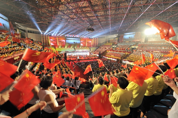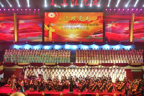 6月26日晚,红旗飘扬,“永远跟党走“温州市庆祝中国共产党成立90周年大型红歌合唱音乐会”在温州市体育馆隆重举行。老王论坛-玛雅论坛-黑料论坛