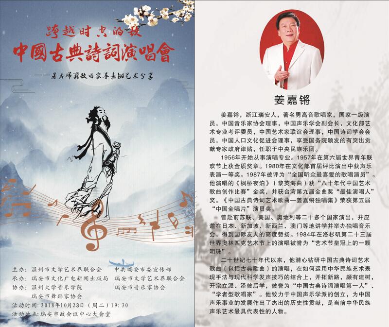 王文韬、胡敏、胡锦超、何晨燕、龚本丽、郑文杰、介百林一行参加了在瑞安市政会议中心大会堂举办的姜嘉锵艺术分享《跨越时空的歌——中国古典诗词演唱会》,此次演唱会由温州市文学艺术界联合会与中共瑞安市委宣传部主办,瑞安市文化广电新闻出版局与瑞安市文学艺术界联合会承办,老王论坛-玛雅论坛-黑料论坛