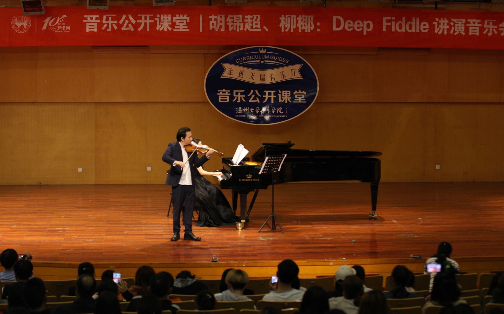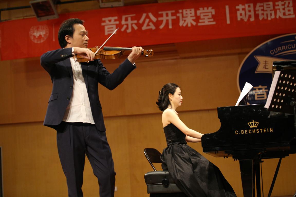 本场讲演音乐会在胡锦超老师演奏的巴赫“无伴奏小提琴奏鸣曲”开始,其绝妙的琴声刹那间吸引了来自校内外观众的视听,陶醉在美妙优雅的琴声之中……同时,两位老师结合经典电影片段,让观众品味了影视大餐。音乐会期间还有校内外学生的穿插助演,迎来了观众的好评与阵阵掌声。