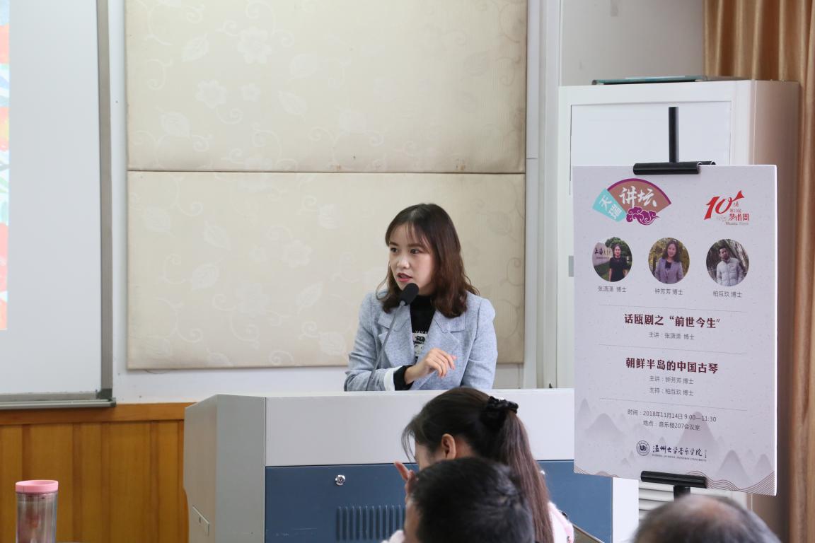 钟芳芳博士主讲的题目是《朝鲜半岛的中国古琴》,钟老师首先从起源、形制两方面介绍了朝鲜半岛的玄琴。作为韩国的传统乐器,有史料记载玄琴由4世纪中国晋朝送给高句丽的七弦琴改造而来,但学界对此有较大争议,既有由“卧箜篌”而来的观点,也有由“七弦琴”与“卧箜篌”相结合之说。钟老师综合比较文献、图像相关资料,认为玄琴与七弦琴的音位数、演奏法不同,整体更接近于卧箜篌。接着,钟老师引用大量文献史料,对古琴东传朝鲜半岛的历史进程进行了考证。其一,因宋朝向高丽朝赠送雅乐器、乐谱和佾舞,高丽朝承接了中国的雅乐,“雅乐用”古琴随之东传朝鲜半岛;其二,朝鲜王朝以儒教治国,文人追捧“程朱理学”,效仿中国文人习琴,在朝鲜半岛掀起了“古琴热”,促使了古琴在朝鲜半岛的“本土化”,并出现了许多编撰的古琴谱与古琴书籍。最后,钟老师还就古琴东传朝鲜提出了如20世纪以后古琴缘何在朝鲜半岛失传等问题,与在场师生进行了交流。
