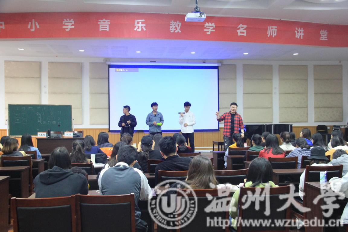 首先,魏宁老师以“学习音乐的关键是什么”的问题来引入主题,同学们争先发言答案也是“五花八门”。为了能够让同学们更加透彻的了解节奏在音乐中的重要性,魏宁老师为大家播放了许多乐队排练的视频,有外国的流行乐队,也有国内的民乐团。通过这些视频同学们也更加了解了节奏在一个乐曲或者对于整个乐队的重要性,通过节奏的快慢、强弱的变化,整个乐队的旋律也会随之变化。就像魏宁老师在公开课上说的“经过节奏的千变万化,能够使音乐更加的丰富”,一个乐队的最高境界不是掌握节奏,而是能够巧妙的玩转节奏。可以说节奏是音乐的灵魂,是一3个乐队的主宰者。在这之后,魏宁老师带着大家开始真正的“玩转节奏”,同学们参与其中与魏宁老师钢琴伴奏还有自制乐器一起配合完成了一场节奏盛宴。
