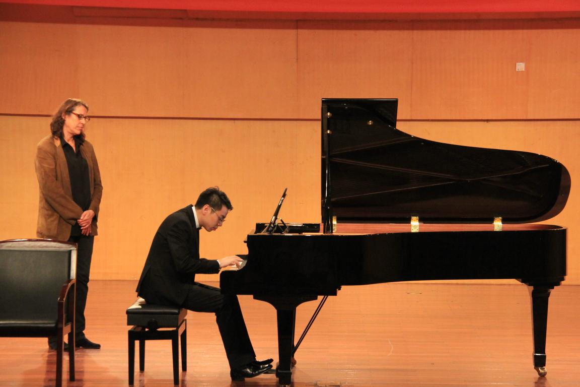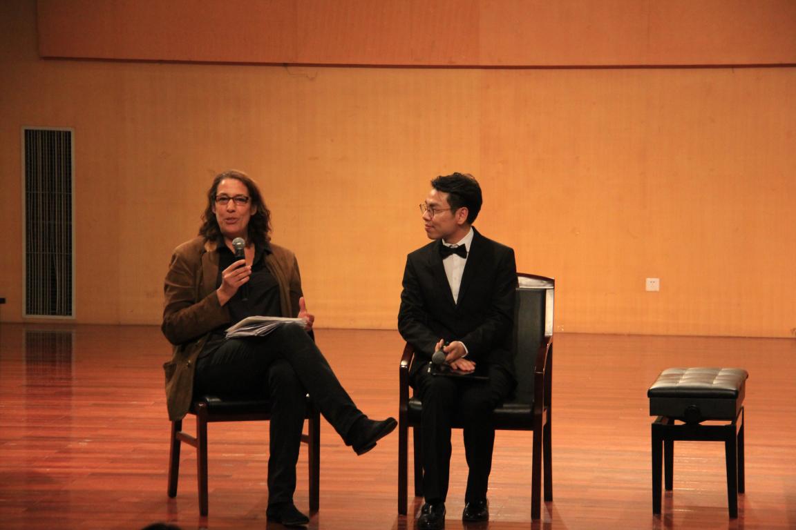 客座教授。聘书颁发仪式过后,Sibylla Joedicke教授与大家分享了今天的第一首钢琴曲海顿的《c小调奏鸣曲》,由原方启雄老师为大家演奏。演奏完毕后 Sibylla Joedicke教授为大家解析了这首钢琴曲以及自己在弹奏时的一些心得体会。在解析时,没有放过一点细节,例如:乐句的连贯性、强弱、分句等。为了突出强弱,作曲家通常将相对不协和的和弦表示强而相对协和的和弦表示弱。第二首钢琴曲是莫扎特的《c小调幻想曲》,依旧是由原方启雄老师为大家演奏。莫扎特除了他的钢琴曲十分优秀,还有他的歌剧院也十分著名。这首钢琴曲就包含了很大的戏剧性,冲突对比鲜明,张力性十分强烈,仿佛为我们讲述了一个故事。这首钢琴曲包含着两个主题,一个是苦苦哀求的人,另一个则像是两个人在对话。情感丰富、表现性十足。在这两首钢琴曲之后,Sibylla Joedicke教授和原方启雄老师还为我们介绍了贝多芬以及舒伯特的音乐风格。在我们练习弹奏舒伯特的作品时,我们可以通过钢琴来模仿整个交响乐团的乐器的方式来演奏练习。接下来,原方启雄老师为我们演奏了舒伯特的《G大调奏鸣曲》。再弹奏了两首钢琴曲以后,原方启雄老师依然能够保持高水平的演奏以及饱满的情感来完成第三首作品,可见原方启雄老师的功底非凡。Sibylla Joedicke教授说:“舒伯特最难的地方就是要去模仿不同音色,同时还要注意乐句的连贯”。所以,我们在弹钢琴的同时要学会哼唱旋律。一个真正的钢琴家也一定会去了解声乐和指挥,这有助于更好的去演绎作品。最后一首演奏的作品是贝多芬的《C大调奏鸣曲》(第一乐章 黎明)。到此,本次讲演音乐会曲目全部演奏完毕。主持人上台感谢 Sibylla Joedicke教授以及原方启雄老师的精彩讲演。