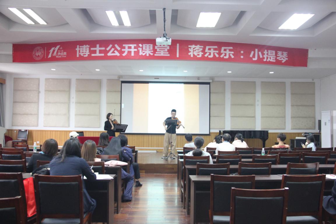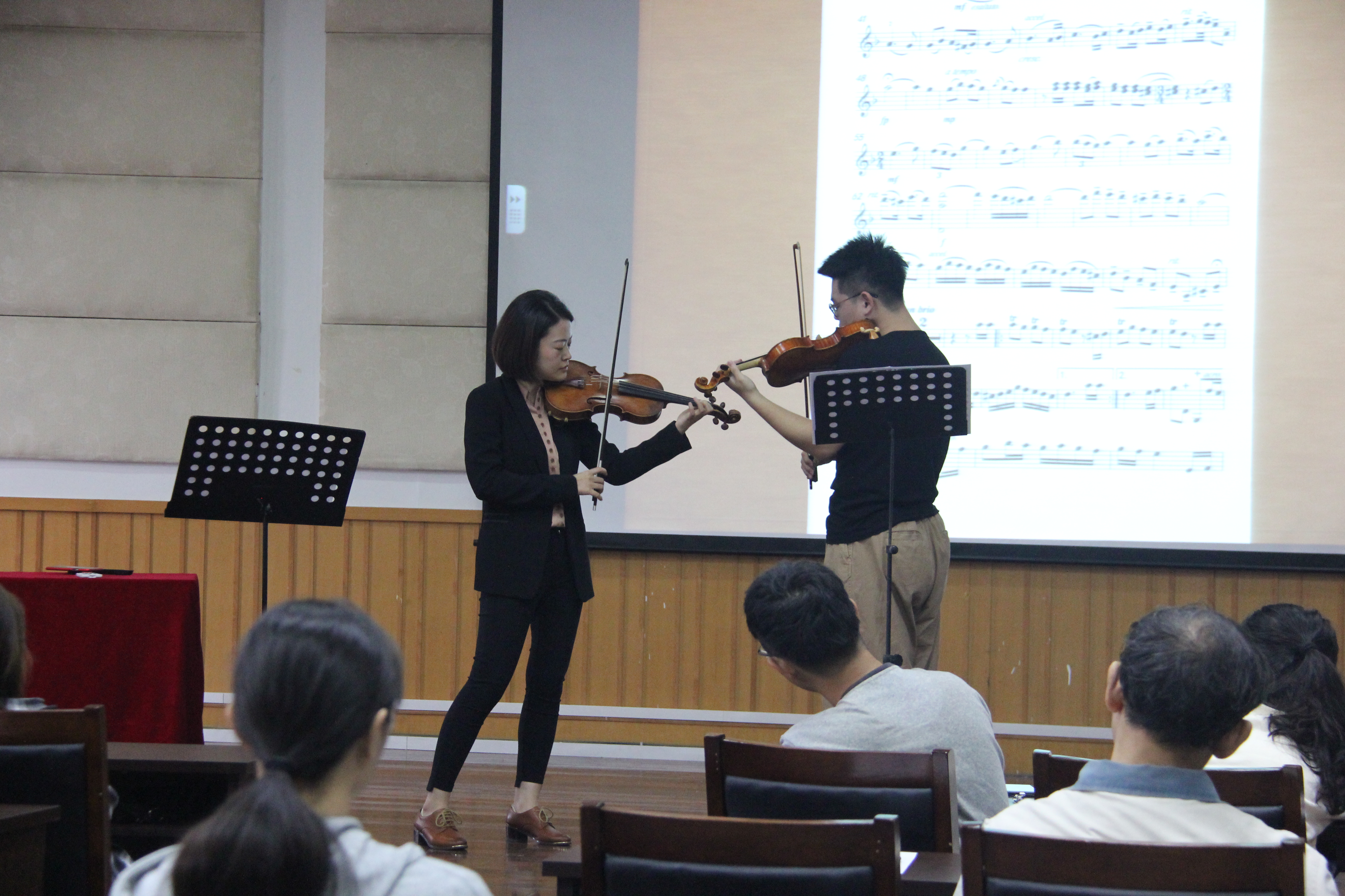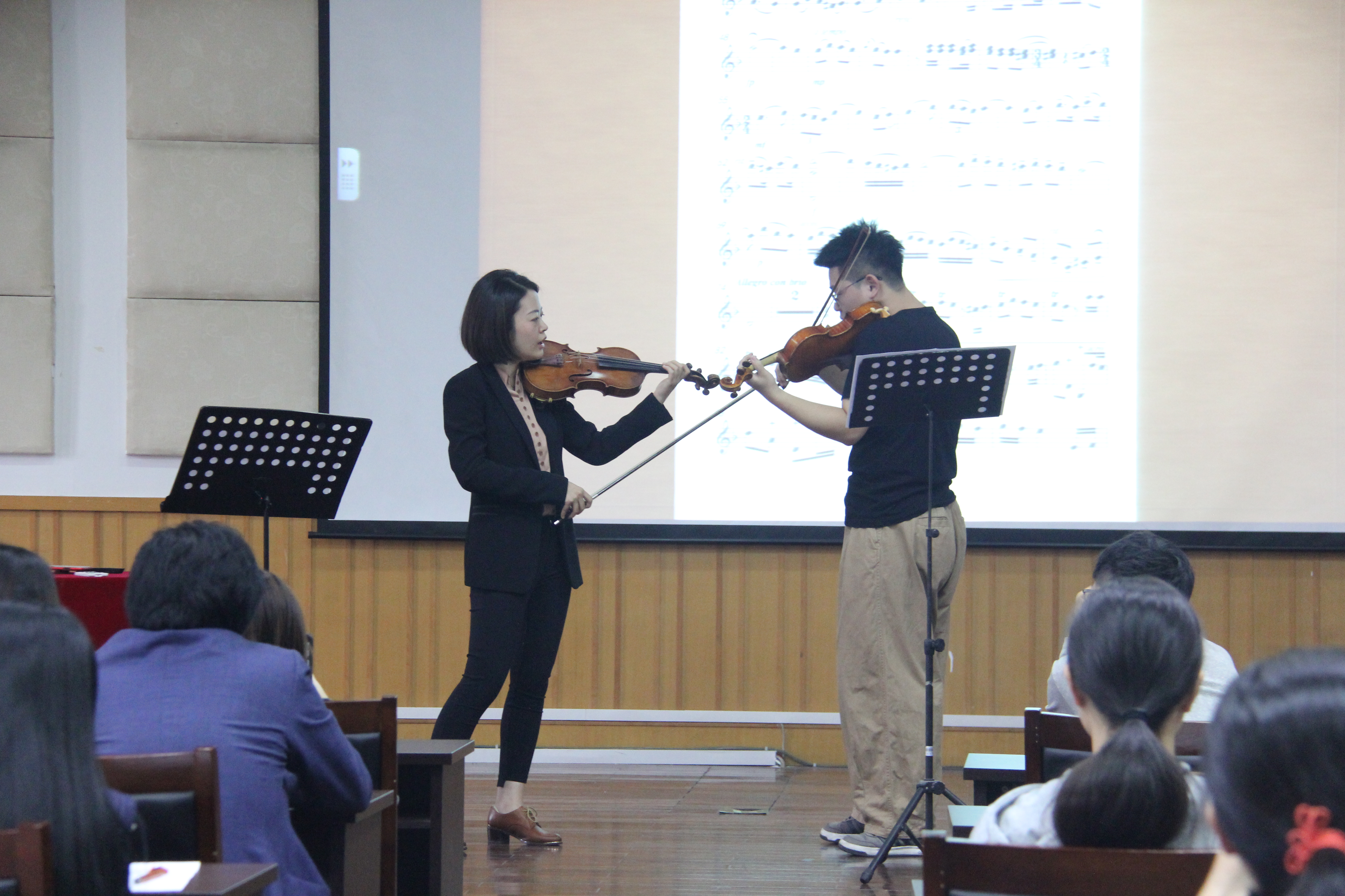 今天,蒋乐乐老师耐心地为学生拉奏曲子做了点评,讲述了曲子的发生地以及对作品进行细致分析,和学生进行细节的处理,随后,老师用非常生动的语言为学生讲解了处理细节上的问题,积极和学生沟通交流,为了让学生更好地学习,蒋乐乐老师给学生做出具体示范教导学生该如何去完成各部分段落。师生间互动十分生动有趣,在座听课的师生都沉浸在乐音中,蒋乐乐老师的公开课让在座的学生及老师都受益颇丰。