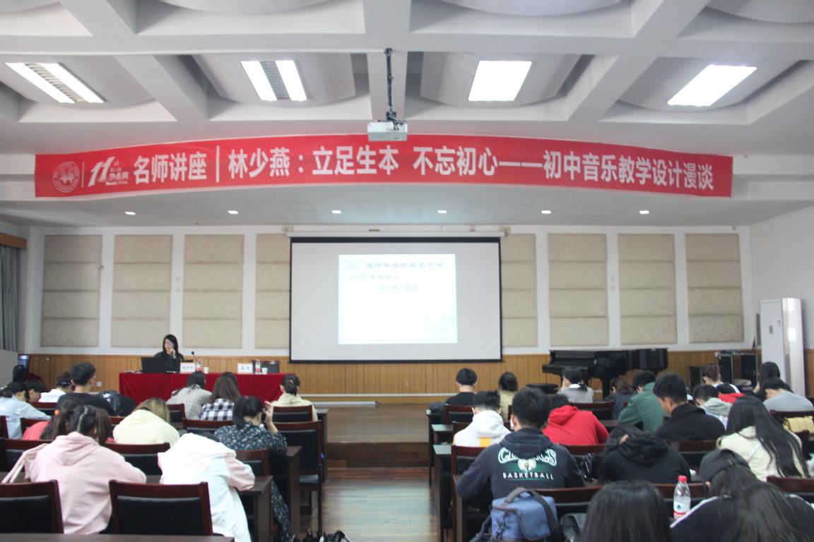 2019年11月8日,我们有幸邀请到了林少燕老师来做主题为立足生本,不忘初心——初中音乐教学设计漫谈。林少燕老师,中学高级教 师,温州市教坛新秀,任教于温州市绣山中学。曾多次荣获浙江省及温州市中小学生艺术节优秀指导师称号。同学们都对于此次讲座表示热烈的期待。