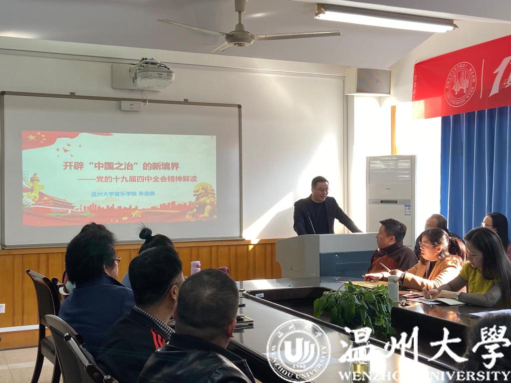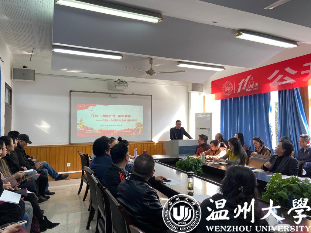 党委于音乐楼203会议室开展党的十九届四中全会精神解读,全体教职工参会,会议由老王论坛