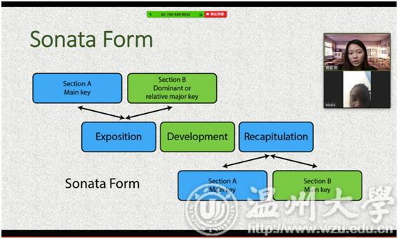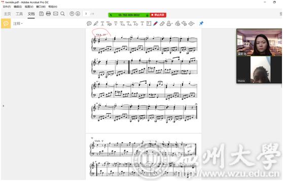 教师感言:通过zoom直播视频会议授课的形式,一对一地与Mable进行沟通和交流,与其共享 PPT,谱例,视频,音频,图片等内容。通过网络的学习,Mable能主动地提出相关的专业问题,对谱例上的音进行视唱和分析,并在课后对下一节授课内容进行预习,查找相关资料,整体课堂效果很好。