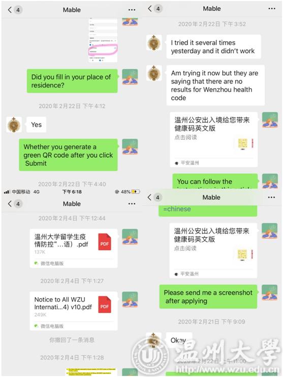 自新冠疫情肺炎发生以来,作为Mable的辅导员,我第一时间与其取得联系,确认她的安全情况并主动将学校关于新冠肺炎的一些信息转发给她,提醒她多加注意。得知她在学校很安全,这让我感到很安心。疫情以来,我密切关注她的日常状况,经常与其沟通,Mable也很有礼貌,积极配合我的工作,尤其是在填写健康码等出现问题时,会主动与我联系,直至问题解决。希望Mable的留学生活一切顺利。