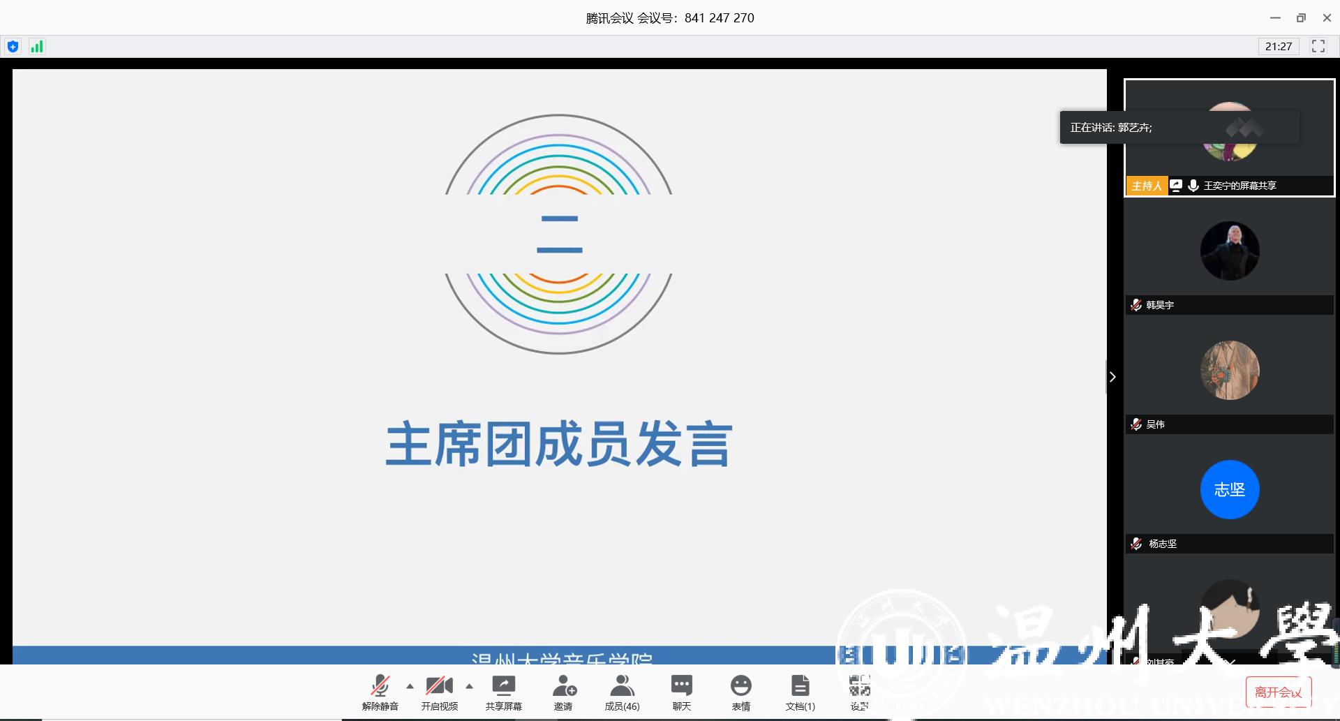 会议由团歌合唱开始后进入主席团发言部分,由钱佳文,王奕宁,郭艺卉,夏大强四位主席团成员发言,他们表达了对于老王论坛