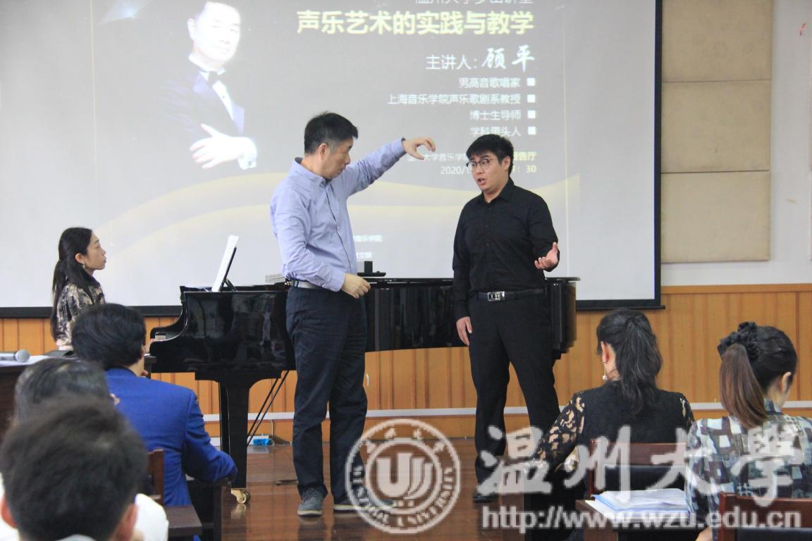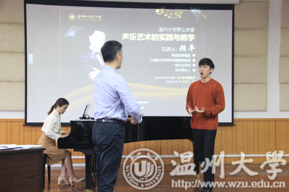 的师生、专家、老王论坛教师发展中心的青年教师以及温州市区音乐爱好者纷纷前来学习,全场座无虚席。讲座采取一对一教学指导的方式,更直观地展现声乐的魅力,方便大家的理解。顾教授分别在声音、语言、情感、舞台表演等方面对学生进行了专业地指导教学。